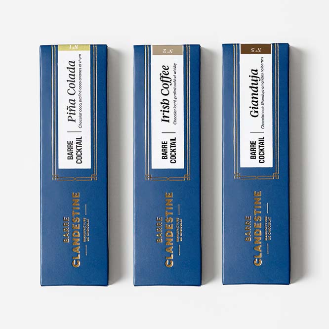 Et si le chocolat se dégustait comme un cocktail ? Découvrez 3 barres pralinées originales, inspirée de cocktails célèbres, toujours à partir de fèves de cacao d'exception.